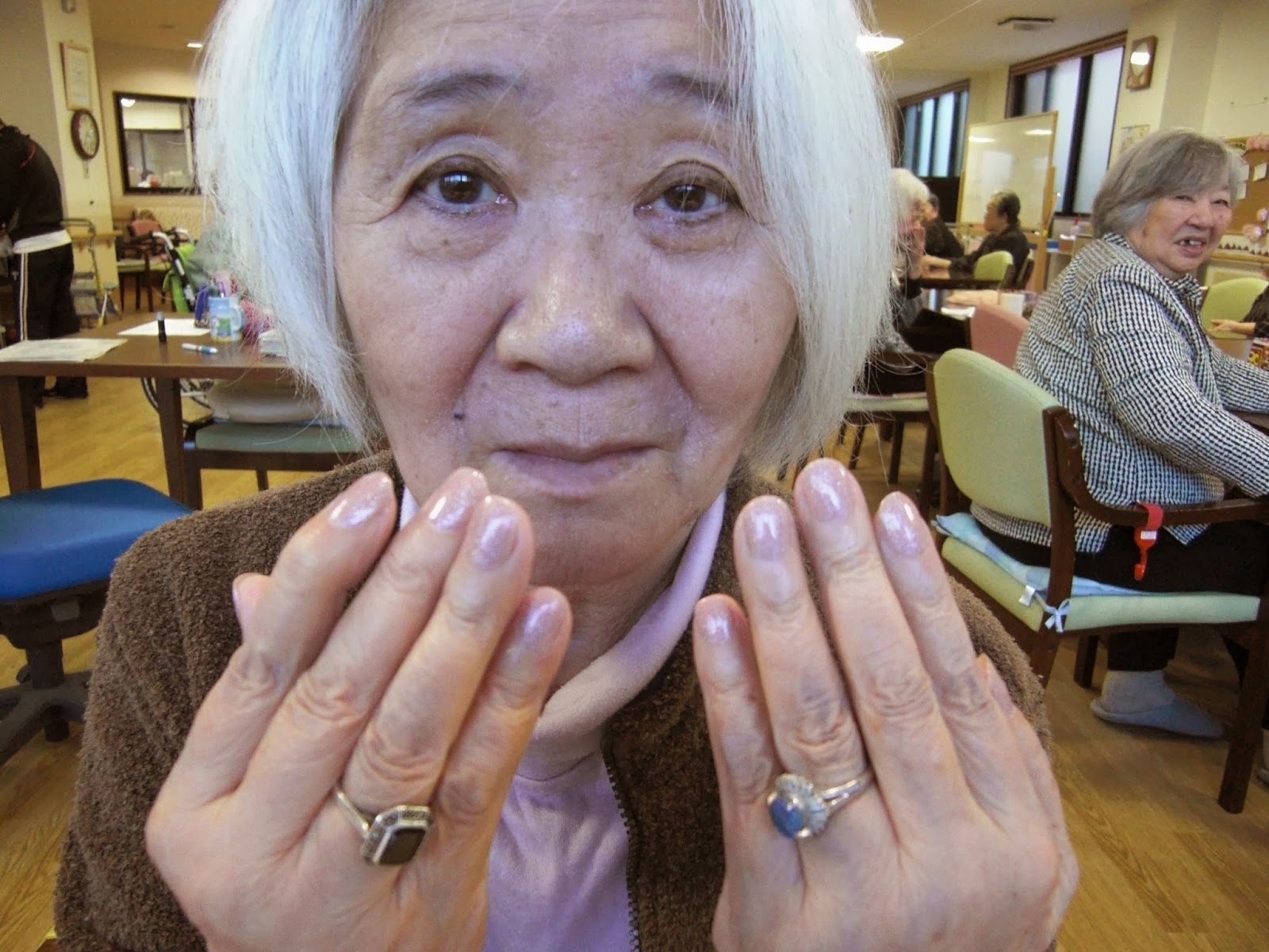 2013年11月8日|ネイルサロン 投稿者:admin 投稿公開日:2013年11月8日 投稿カテゴリー:デイサービスセンター千本笹屋町 / 柊野福祉会 デイサービスセンター千本笹屋町 から 記事が届いています 先日 プロのネイリストさんが ネイルケアのボランティアに来てくださいました 女性のご利用者様にマニキュアを塗って頂きます ラメ入りのかた、花模様を入れてもらったかたなど様々でした 皆様、いくつになっても女性❤ 女子力が高い!!かも それでは きれいな皆様の写真をお見せします 完成したご自身の指を笑顔で眺めておられる姿が印象的でした また機会があれば来て頂けるとのことで女性ご利用者は楽しみにされています タグ: デイサービスセンター千本笹屋町 その他の記事を読む 前の投稿2013年11月9日|おやつ作り次の投稿2013年12月6日|紅葉ドライブ おすすめ 2015年4月4日|パズル 2015年4月4日 2013年3月3日|33(みみ)より情報! 2013年3月3日 2015年8月4日|夏のお食事会~流しそうめん 2015年8月4日